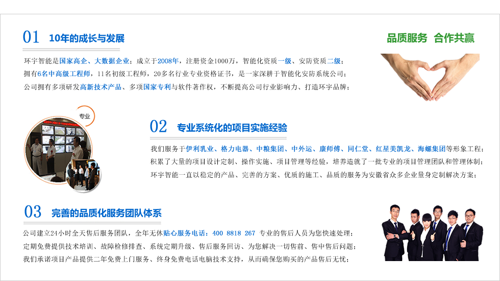 合肥市環宇智能工程有限公司成立于2008年科創版上市企業,現注冊資金1000整,電子與智能化系統集成資質壹級,安防資質,是“國家高新技術企業”、“合肥市高新技術產品認定企業”、“安徽省安防協會會員單位”、“AAA級信用等級認證企業”、“AAA級重合同守信用企業”、“合肥市創新型企業”、是行業領先的智能化整體解決方案的集成商。